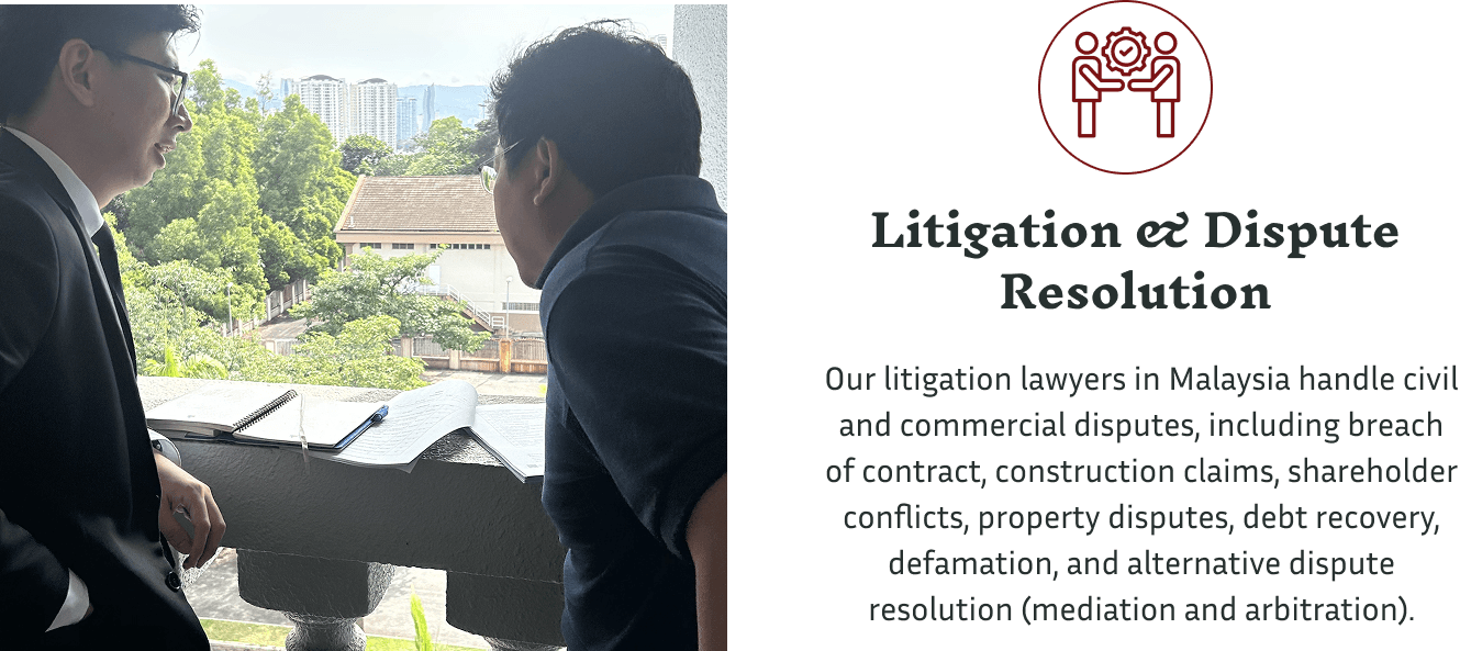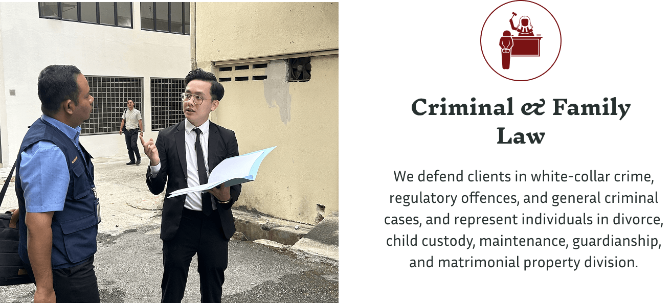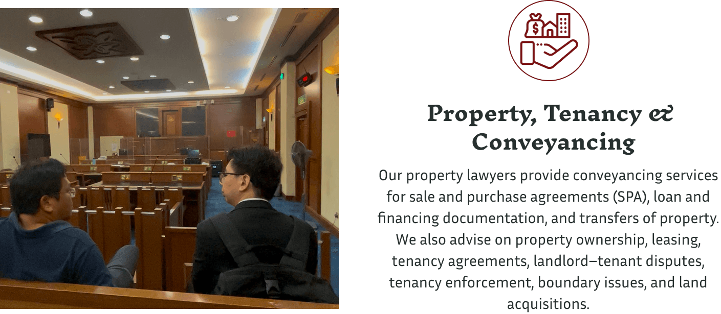 Comprehensive conveyancing services, including SPA, loan documentation, property transfers, tenancy agreement drafting, landlord–tenant dispute resolution, and enforcement of
