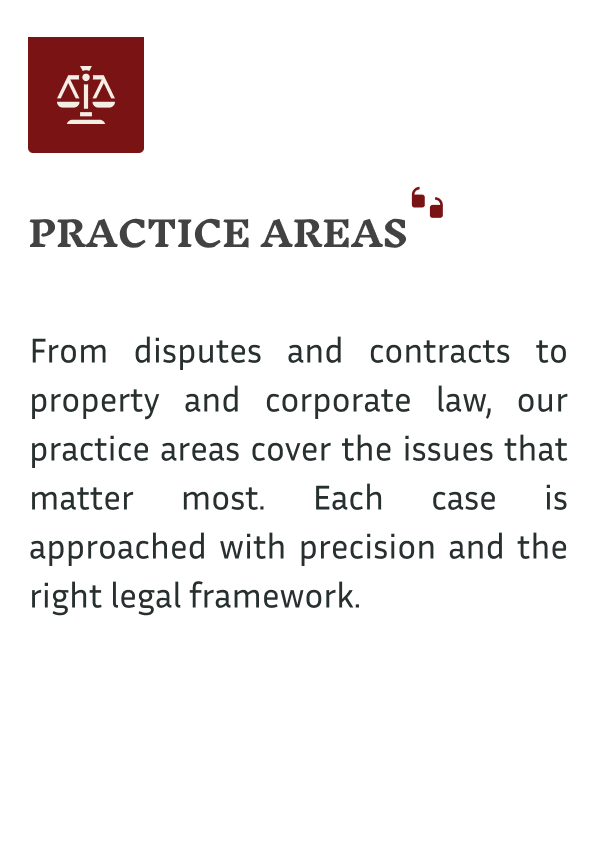Our practice areas span Civil Litigation, Criminal Law, Family and Matrimonial Disputes, Debt Recovery, Probate and Wills Writing, Land Law, Contractual Disputes, and Alternative Dispute Resolution (ADR). We also provide specialized services in Corporate Advisory, Company Secretarial, Contract Drafting and Negotiation, and Web3 & Blockchain advisory.
